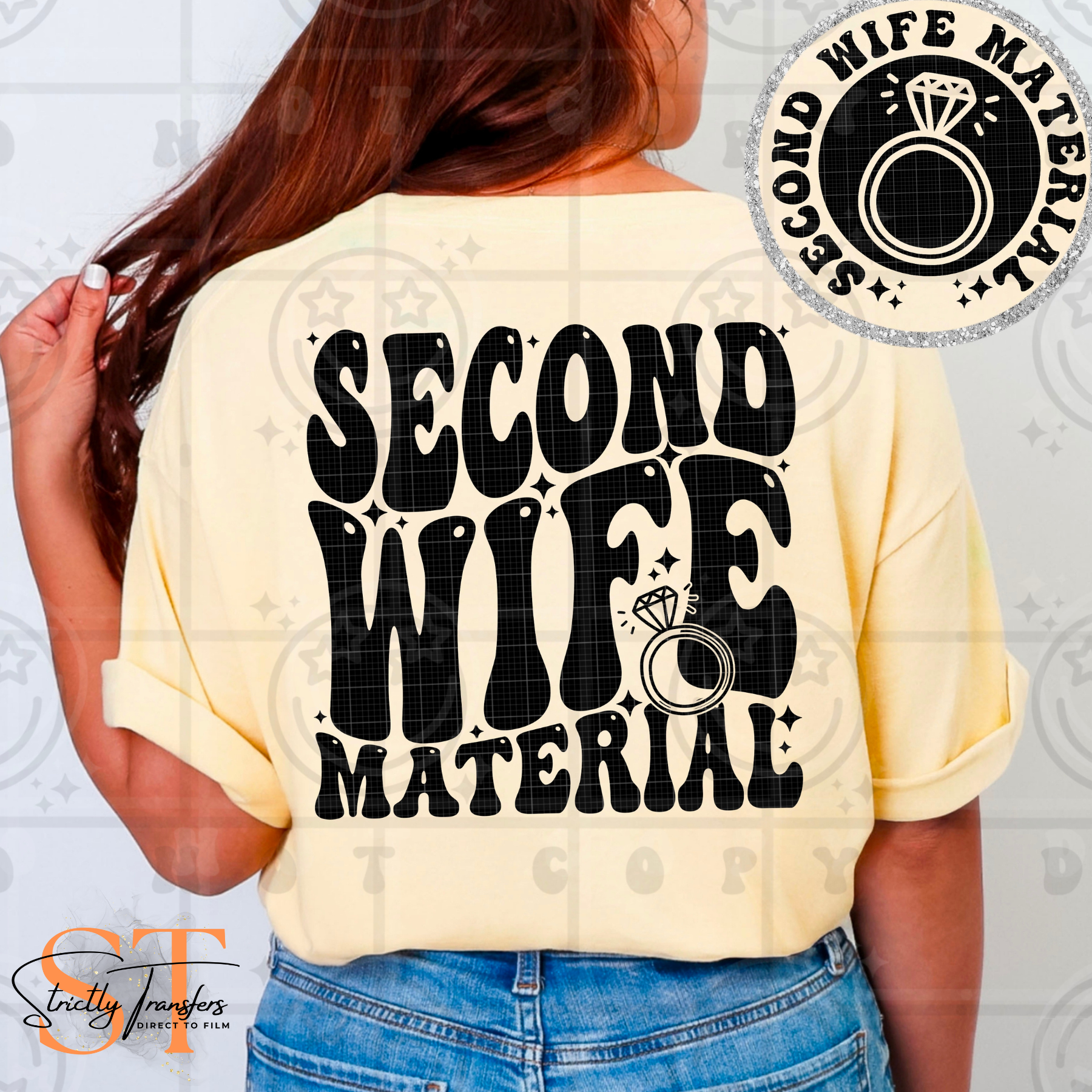 Second Wife Material with pocket detail included Direct to Film Transfers
